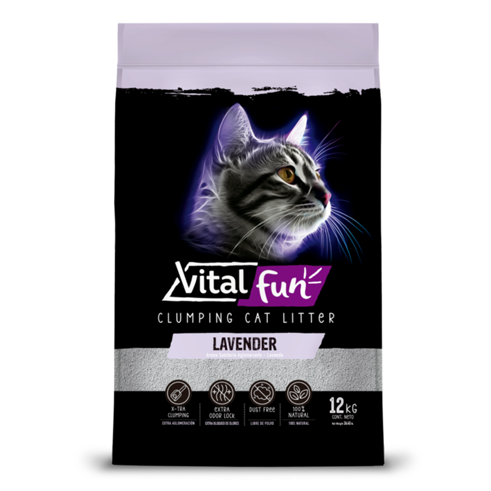 La arena aglomerante Vitalfun Clumping Cat Litter Lavanda en su presentación de 12 kilogramos combina rendimiento, frescura y eficacia para ofrecer la mejor experiencia de higiene tanto para tu gato como para tu hogar. Elaborada con bentonita natural de alta calidad, esta arena forma grumos compactos y resistentes, neutraliza los malos olores y mantiene la bandeja sanitaria siempre limpia y seca.